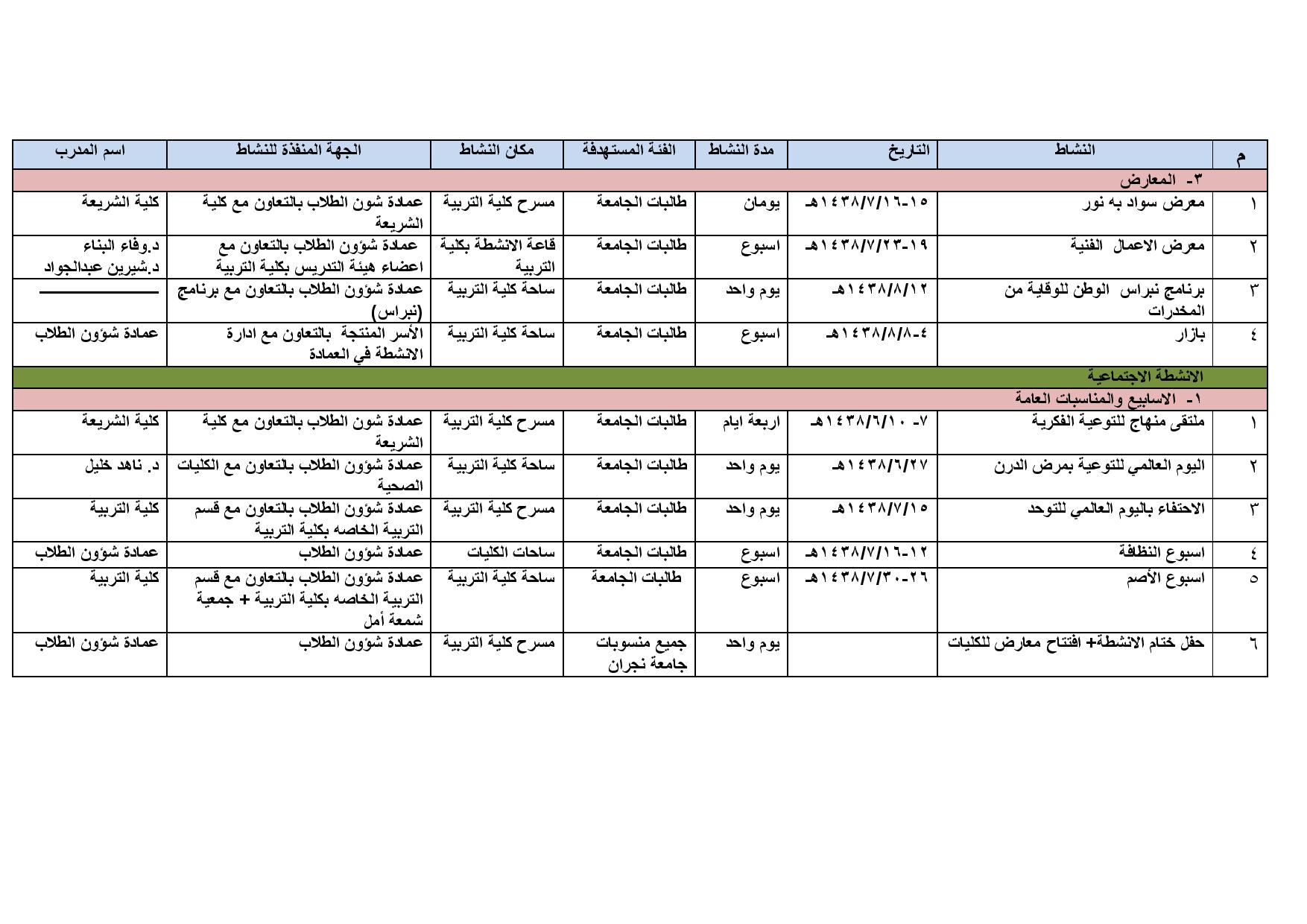 Deanship Of Students Affairs خطة التنفيذية للانشطة الطلابية للعام 1437 1438 شطر الطالبات